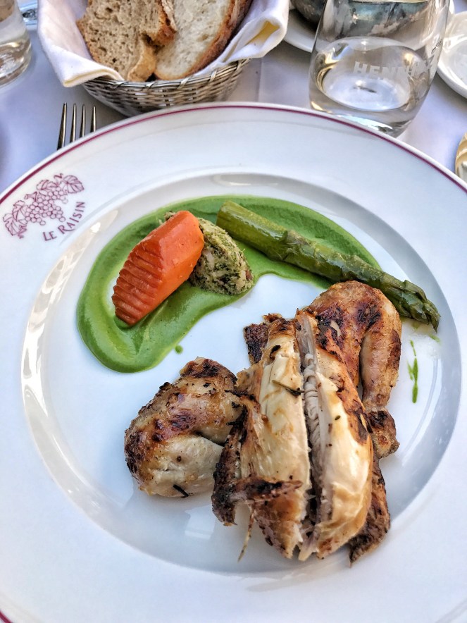 For mains we decided on two specialities of the Auberge: “Le coquelet suisse rôti entier à la broche, sauce à la moutarde de Dijon” – a whole-roasted small chicken with mustard sauce, and “Travers de porc caramélisés à la broche” – caramelised pork ribs. In traditional style, they bring out your cooked meat, still in its pan, to the table to whet your appetite before whisking it away again to carve.