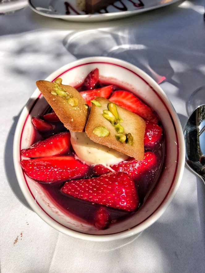 Reinvigorated, and by now a little bit tipsy, two desserts were called for! A chocolate mousse with raspberry ice cream, and strawberries macerated in sangria with pistachio ice cream. So. good. The richness of the chocolate mousse was cut through perfectly by the sharpness of the raspberries.